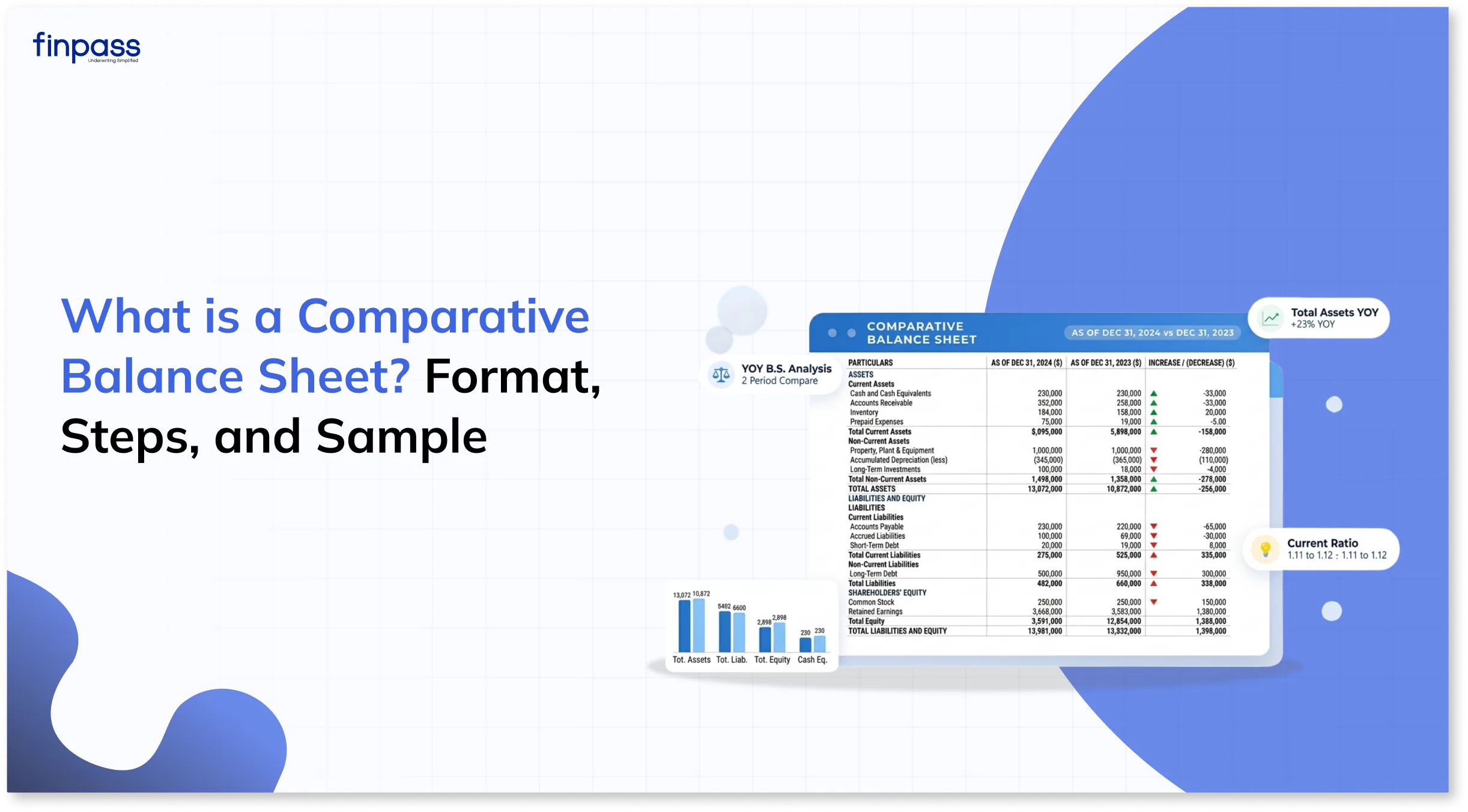 A Comparative Balance Sheet is a side-by-side comparison of the full balance sheet report of a current accounting period and the previous accounting period. Comparison helps in identifying trends, direction of change, analyzing, and taking the right action. It provides a comparison of a company’s assets, liabilities, and shareholders' equity.